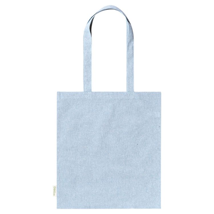 Bolsa de la compra reutilizable de algodón reciclado con asas largas y etiqueta distintiva de algodón reciclado. 100% algodón reciclado, 140 g/m².