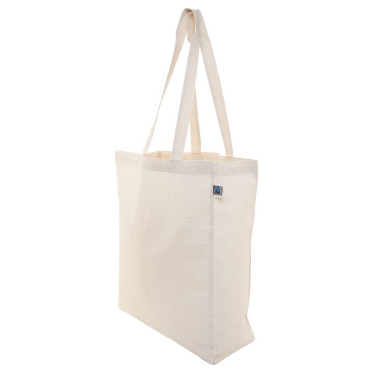 Bolsa de la compra reutilizable de algodón Fairtrade con fuelle y asas largas. 100% algodón Fairtrade, 180 g/m². Con sello distintivo Fairtrade, de color natural