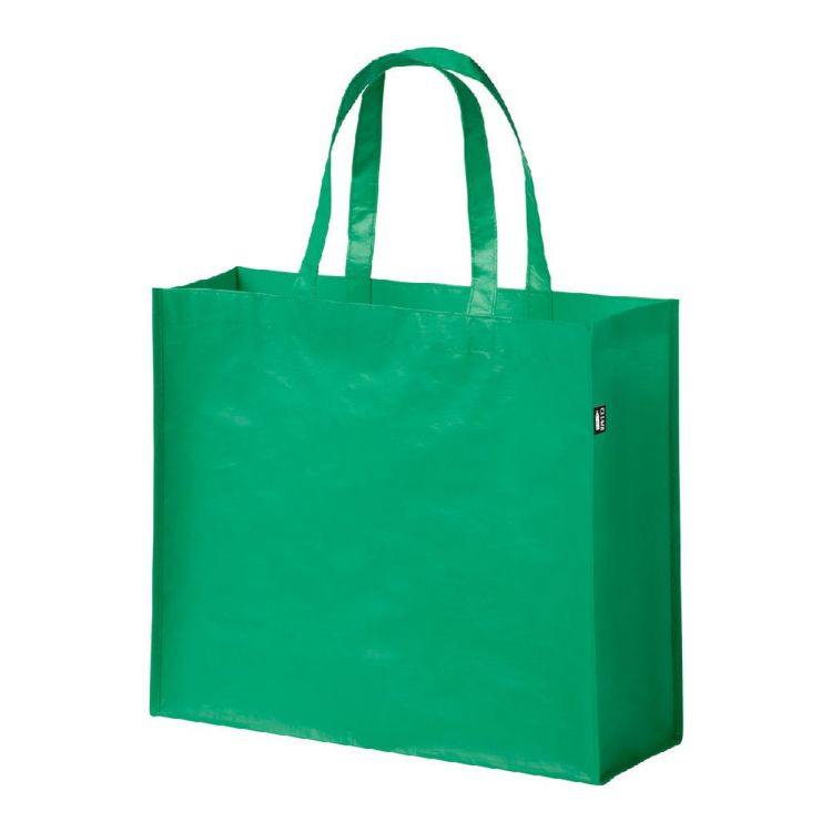 Bolsa de la compra RPET laminada con fuelle y asas medianas, RPET poliéster 105 g/m². Con etiqueta RPET distintiva.