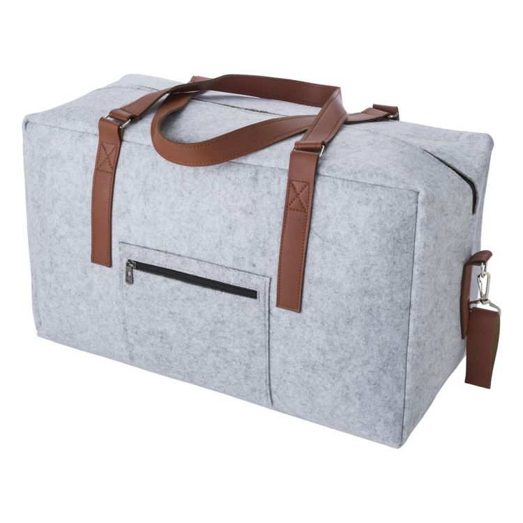Bolsa de fieltro rPET con detalles y asas de PU. Un compartimento grande con cremallera y un bolsillo pequeño tambíen con cremallera. Gran capacidad.