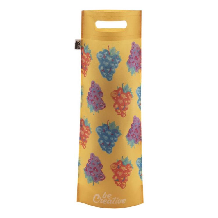 Bolsa para vino de RPET no tejido, hecha a medida, con asas troqueladas, 80 g/m². Con gráficos impresos por sublimación en ambas caras y etiqueta RPET distintiva. Cantidad mínima: 50 unidades