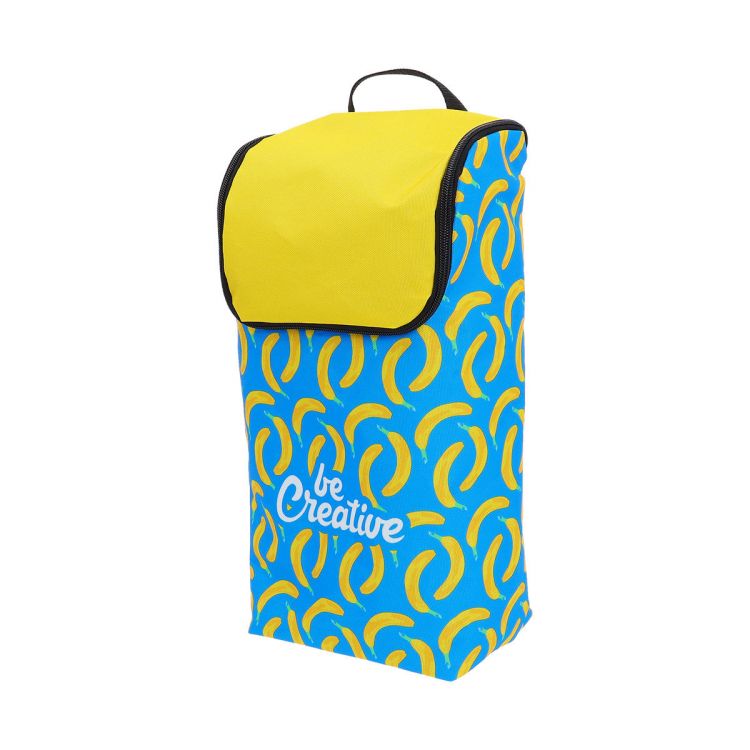 Bolsa para zapatos con cremallera, fabricada a medida, en poliéster RPET 600D con asa de transporte. Con gráficos impresos por sublimación en toda la superficie y etiqueta RPET distintiva. Cantidad mínima: 25 unidades.