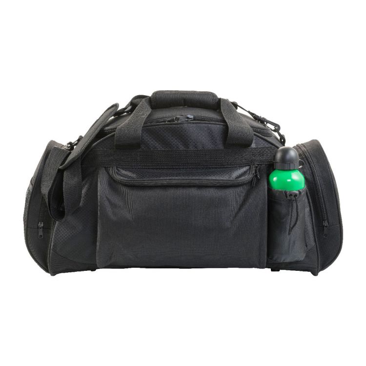 Bolsa deportiva o de viaje, de poliéster (600 D) con bolsillo de cierre cremallera y bolsita de cierre cordón para 1 botella en la parte frontal. En uno de los bolsillos laterales tiene una salida para auriculares. Cuenta con gran compartimento central con cierre cremallera.