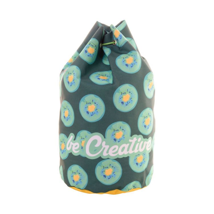 Bolsa marinera con cordón, hecha a medida, de poliéster RPET 600D, con cordones de colores. Con gráficos impresos por sublimación y etiqueta RPET distintiva. Cantidad mínima: 25 unidades.