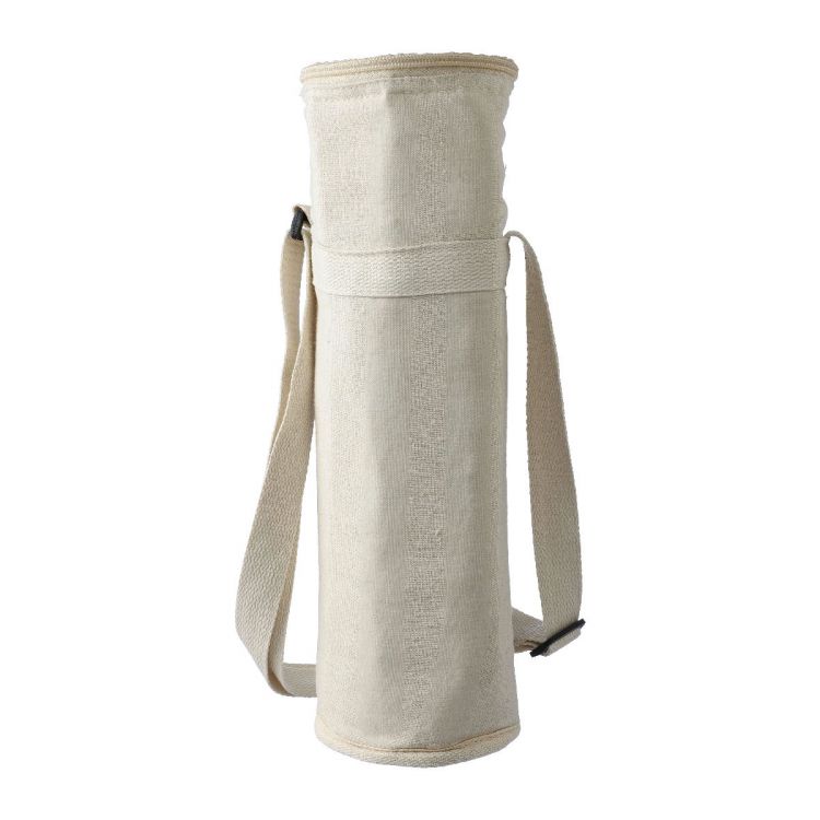 Bolsa isotérmica para 1 botella (máx. 1,5 litros) de algodón reciclado (270 g/m2) con revestimiento interior de EPE de 2 mm y PEVA de 12 C. Cierre de cremallera. Correa larga y ajustable. Incluye etiqueta de algodón reciclado en el exterior.