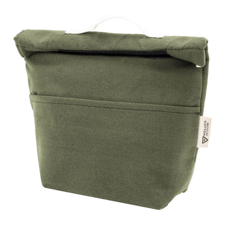 Bolsa térmica enrollable de canvas reciclado con bolsillo delantero, acolchado de aluminio y cierre de velcro. 70 % algodón reciclado y 30 % poliéster RPET. Con etiqueta distintiva de algodón reciclado.