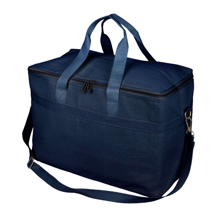 Bolsa nevera de polialgodón reciclado (330 g/m2) con capacidad de 23 l. Tiene dos asas de transporte (3,5 × 60 cm), una cinta de hombro regulable (2,5 × 110 cm) con cierre de hebilla de metal y cincha a juego. Aislamiento de lámina de aluminio. Etiqueta rPET en el exterior y etiqueta en el interior.