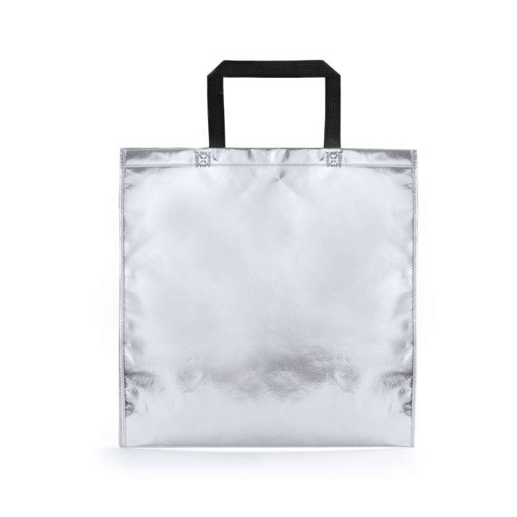 Bolsa en non-woven laminado de acabado metalizado. Disponible en colores dorado, plateado y oro rosa. Con asas medianas reforzadas de 42 cm de largo. De acabado termosellado, con fuelles y ribetes reforzados. Resistencia hasta 7kg de peso.