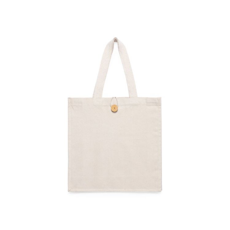 Bolsa fabricada en algodón 100%, de acabado natural y en gramaje extra de 310g/m2. Con original cierre de botón, acabado cosido y con fuelle. Asas medianas extra anchas y reforzadas (60 x 3,5 cm). Resistencia hasta 10 kg de peso. (color natural)
