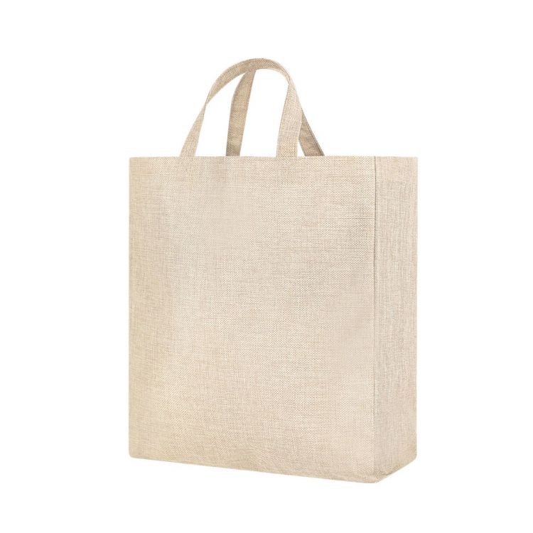 Bolsa fabricada en suave y resistente poliéster, ideal para personalización mediante impresión por sublimación. Con fuelle y asas reforzadas. Resistencia hasta 6 kg de peso. (color natural)