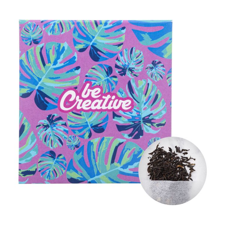 Bolsita de té envuelta individualmente en una funda de papel personalizada con impresión a todo color. Contiene 1,2 gramos (1 bolsita) de té. Cantidad mínima de pedido: 100 unidades