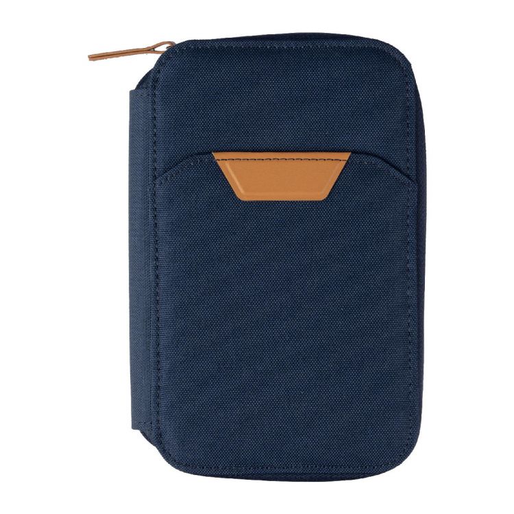 Cartera de viaje de rPet con detalles de PU y cremallera. Protección RFID en el interior. Incluye soporte para teléfono móvil, varios compartimentos y un pequeño bolsillo frontal. Presentada en una caja de cartón marrón.