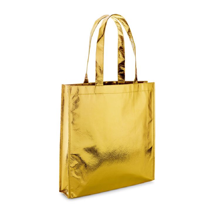 Bolsa de non-woven laminado con acabado brillante (90 g/m²) y asas de 50 cm. 340 x 350 x 80 mm. Producto en color oro