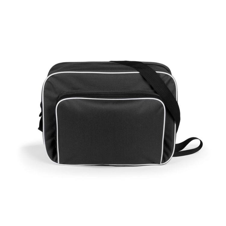 Bolso multiusos en resistente poliéster 600D de desenfadado diseño bicolor en amplia gama de colores, con ribetes de refuerzo en color blanco. Compartimento principal y bolsillo exterior con cierre de cremallera en color negro. Con resistente cinta bandolera ajustable en color negro. Base reforzada con superficie antideslizante.