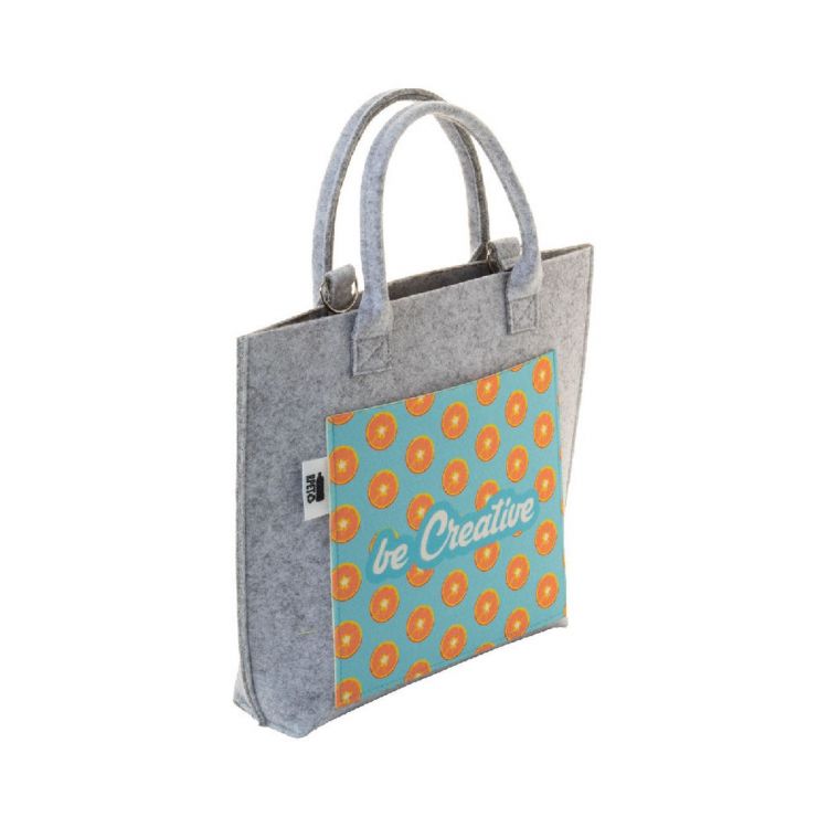 Bolso cruzado de fieltro RPET hecho a medida con bolsillo frontal impreso a todo color. Con asas cortas, bandolera desmontable y etiqueta RPET distintiva. El precio incluye impresión por sublimación. Cantidad mínima: 25 unidades