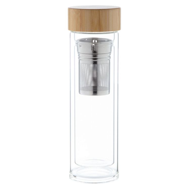 Botella aislante de vidrio borosilicato de doble pared con infusor de té y tapa de bambú. 420 ml