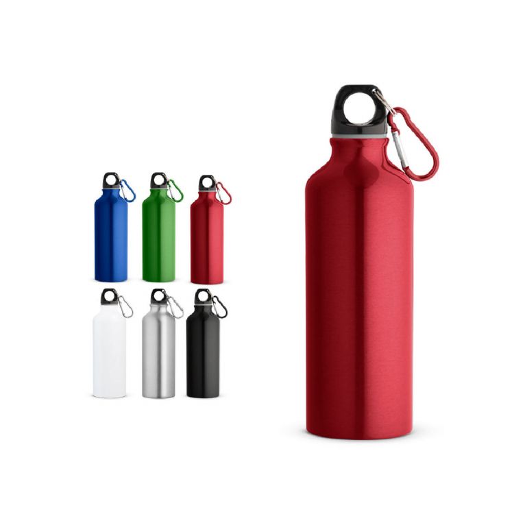 Botella deportiva de aluminio reciclado (100% rAL) con mosquetón para facilitar su transporte. Capacidad hasta 530 ml. ø66 x 210 mm