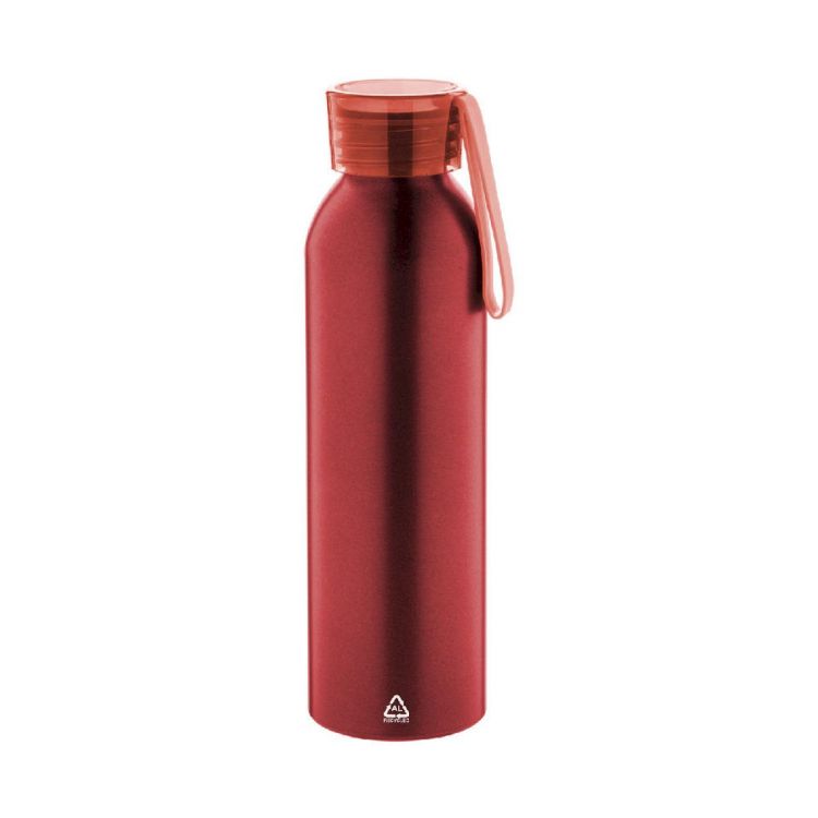 Botella de aluminio reciclado con tapa del mismo color y correa de transporte de silicona, 600 ml.
