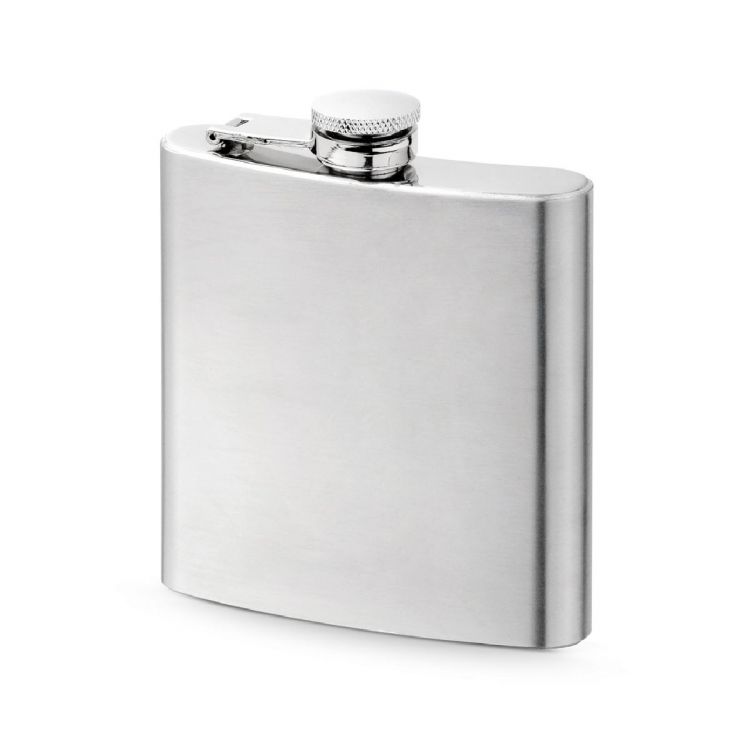 Petaca de acero inoxidable, con capacidad hasta 180 mL. Suministrado en una caja de regalo. 100 x 110 x 25 mm. Producto en color plata
