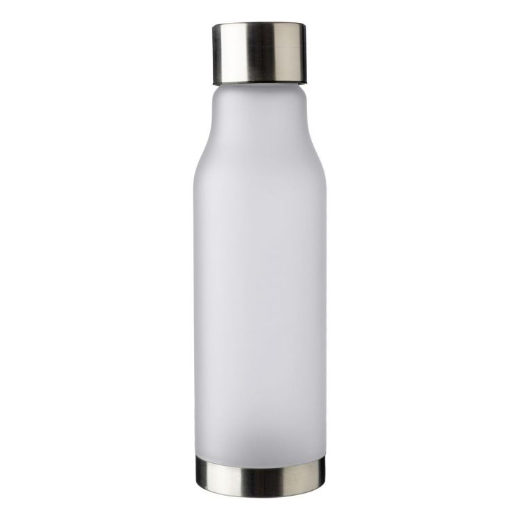 Botella de rPet (600 ml) con tapa y fondo de acero inoxidable (201). Acabado de goma en la botella con aspecto glaseado. Presentada envuelta en papel tisú.