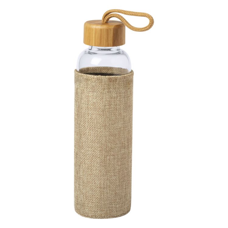 Botella de cristal con funda de poliéster de color natural, tapa de bambú y correa de transporte, 500 ml. No apta para bebidas con gas