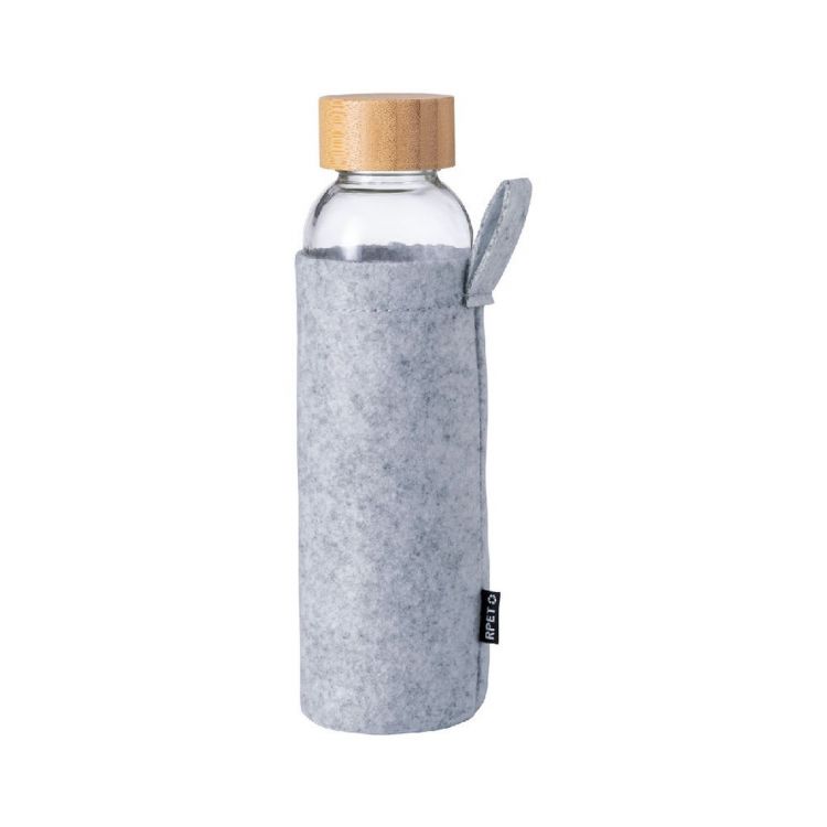 Botella de vidrio con tapón de bambú y bolsa de fieltro RPET, 500 ml. No apta para bebidas carbonatadas, de color gris oscuro