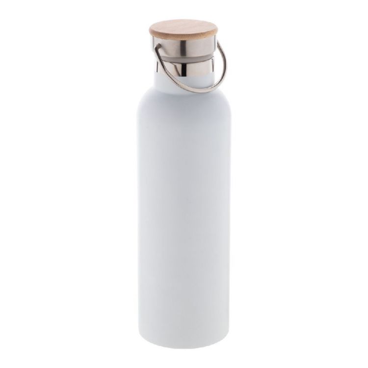 Botella de acero inoxidable de doble pared, aislada por vacío y con tapa de bambú. 750 ml.