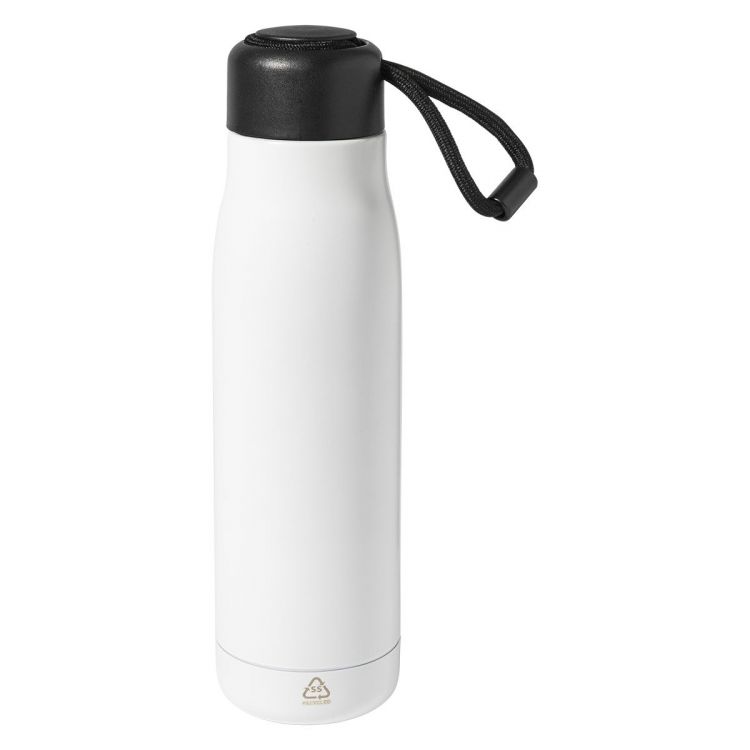 Botella de acero inoxidable reciclado de doble pared con aislamiento al vacío, tapa de polipropileno y cinta de transporte integrada. 500 ml.