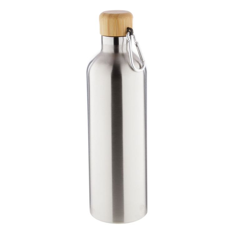 Botella de acero inoxidable de doble pared, aislada al vacío, con tapón de bambú y mosquetón, 500 ml.