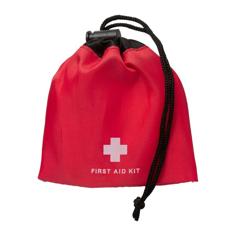 Botiquín de 10 piezas, en una bolsa de ABS con cordón. Contiene 1 toallita limpiadora, 5 tiritas, 2 toallitas de alcohol, 1 toallita antiséptica y 1 gasa. Este producto solo puede venderse y entregarse dentro de la Unión Europea.