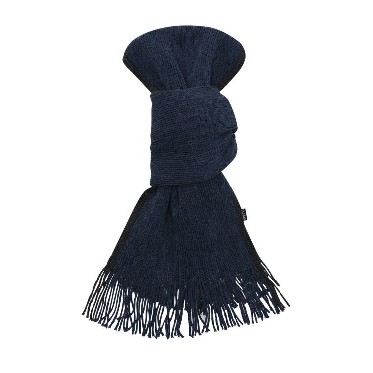 Suave y cálida bufanda confeccionada en cálido poliéster RPET. Fabricada en elegantes colores bitono con bordes en distinto color, terminación en flecos. Con logotipo RPET en etiqueta. Presentada individualmente en caja negra. El material RPET se elabora a partir de plástico reciclado, para así fomentar la reutilización de residuos plásticos y ayudar a la sostenibilidad del planeta.