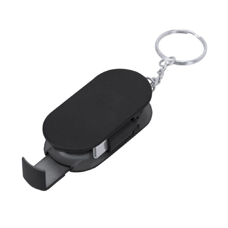Cable Cargador llavero en ABS. Con soporte retráctil en la base para smartphone. Incluye dos entradas de tipo C para función de carga con potencia máxima 60W.