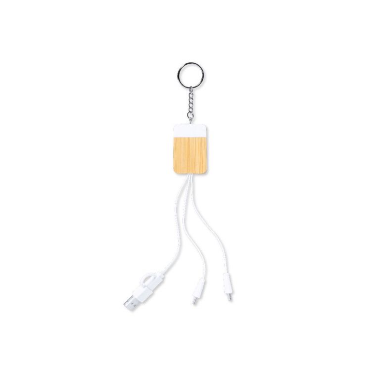 Cable cargador con llavero, fabricado en bambú y con detalle en extracto de mármol. Incluye conexiones de entrada USB y Tipo C, con salidas Lightning, Micro USB y Tipo C 5VDC 2.4A. Presentado en bolsa individual de diseño kraft. (color natural)