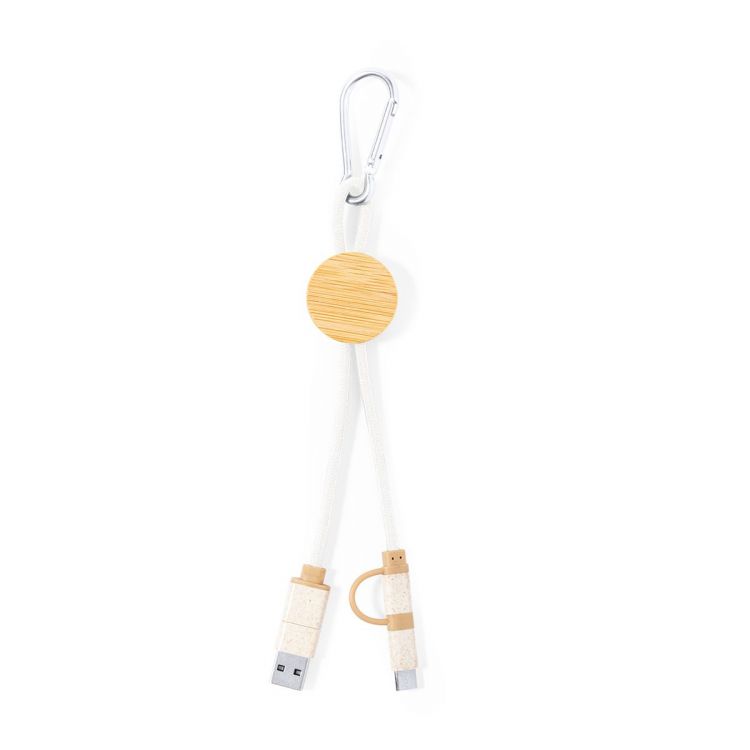 Cable cargador con mosquetón de transporte. Fabricado usando materiales naturales y respetuosos con el medio ambiente:Pieza central en bambú natural.Cables recubiertos de algodón, incluyen conexiones de entrada Tipo C y USB, salidas Lightning, Micro USB y Tipo C. 5V DC 2.4A.Presentado en bolsa individual de diseño kraft. Poner que lleva distintivo en hangtag de bambú y algodón kraft.Elaborado con elementos vegetales para así fomentar la utilización de materias primas naturales y reducir las emisiones contaminantes. (color natural)