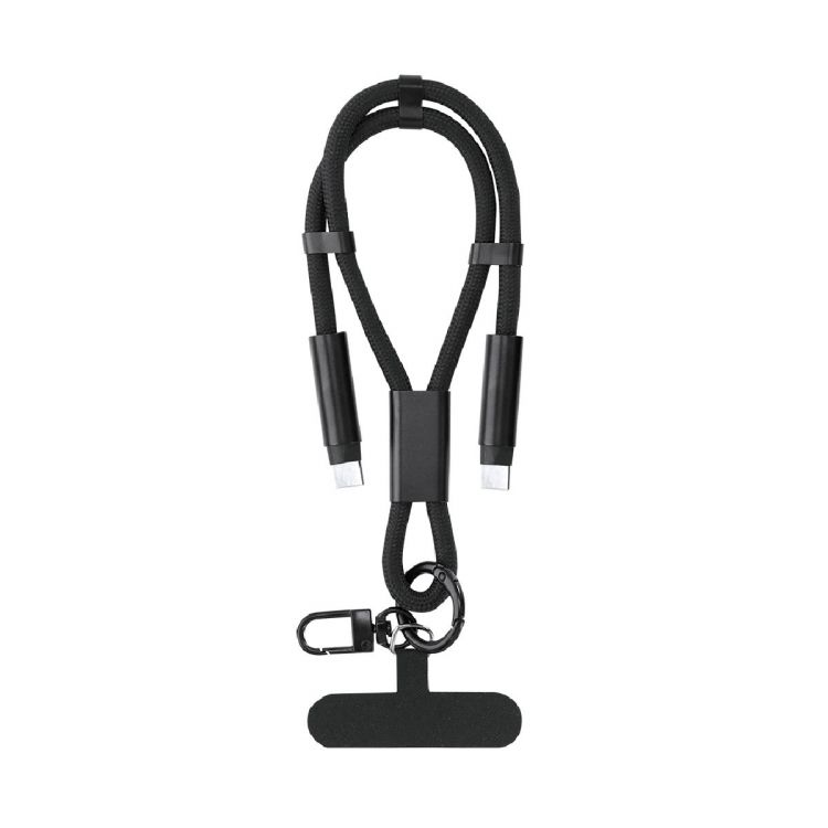 Pulsera con función de soporte y cable cargador, fabricado en una combinación de poliéster RPET. Diseñado para colocarse fácilmente entre la funda y el smartphone gracias a su accesorio de transporte. Incluye cinta a juego, mosquetón metálico giratorio en color negro y accesorio para ajuste en muñeca. Ofrece funcionalidad de carga y traspaso de datos, con entrada Tipo C 60W, y salidas Tipo C.