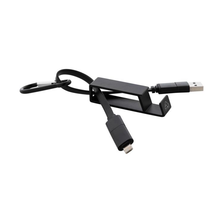 Cable cargador USB con mosquetón de aluminio reciclado y soporte para móvil con función de abrebotellas. Con conectores micro USB, USB-C y Lightning. Con entradas USB y USB-C.