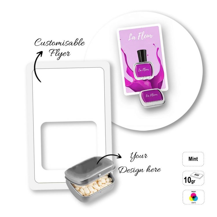 Caja rectangular de caramelos de menta (10 g) colocada dentro de un folleto rectangular de cartón. Las letras del código de producto corresponden al tamaño y forma de la caja: A- caja rectangular de 10 g, B- caja rectangular de 20 g, C- caja redonda de 12 g. Envase: caja metálica reutilizable, folleto de papel totalmente personalizable (acabado del papel: blanco o kraft a elegir en el pedido), bandeja preformada de rPET. Caducidad mínima: 12 meses.