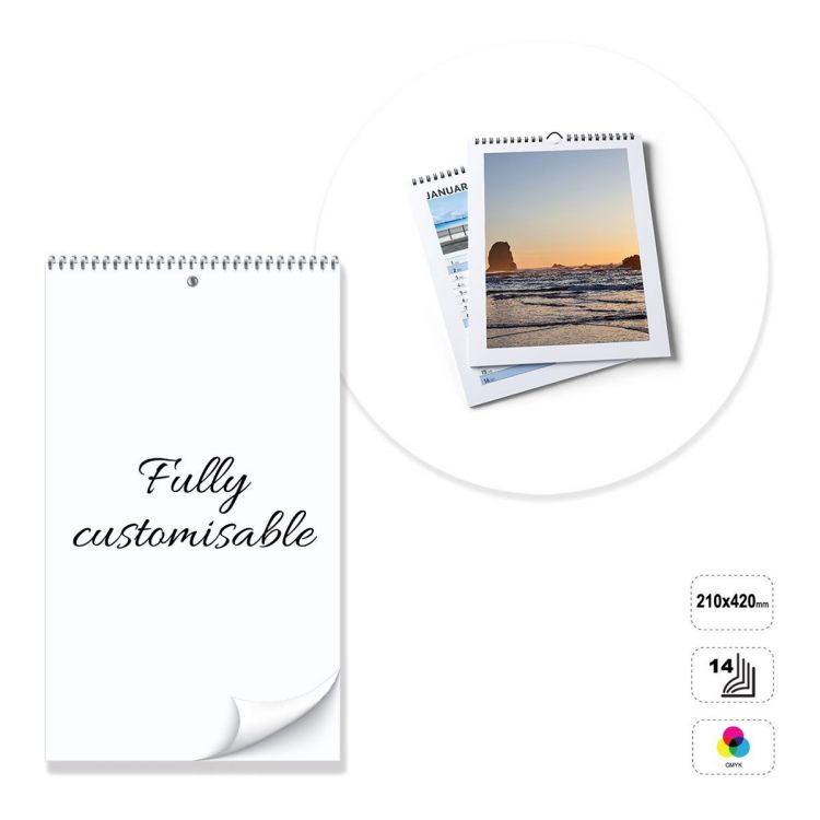 Calendario de pared vertical, totalmente personalizable. El producto consta de 14 hojas de papel estucado mate de 135 g, imprimibles en el anverso o en el anverso y reverso en cuatricromía. Encuadernado con una espiral metálica plateada, blanca o negra en la parte superior. Soporte de cartón blanco de 300 g sin imprimir. El calendario puede personalizarse modificando la plantilla prediseñada, o construirse completamente siguiendo las instrucciones en una plantilla neutra.