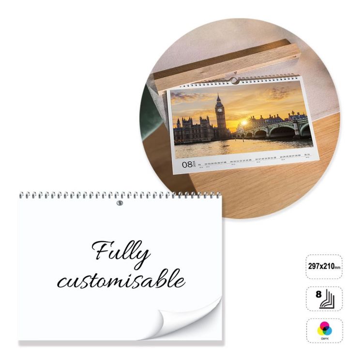 Calendario de pared horizontal, totalmente personalizable. El producto consta de 8 hojas de papel estucado mate de 135 g, imprimibles anverso o anverso y reverso en cuatricromía. Encuadernado con una espiral metálica plateada, blanca o negra en la parte superior. Soporte de cartón blanco de 300 g sin imprimir. El calendario puede personalizarse modificando la plantilla prediseñada, o construirse completamente siguiendo las instrucciones en una plantilla neutra.