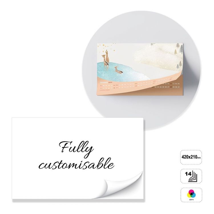 Calendario de pared horizontal, totalmente personalizable. El producto consta de 14 hojas de papel estucado mate de 135 g pegadas en la parte superior con un agujero de 5 mm. El producto puede imprimirse en cuatricromía en el anverso. Soporte de cartón blanco de 300 g sin imprimir. El calendario puede personalizarse modificando la plantilla prediseñada, o construirse por completo siguiendo las instrucciones en una plantilla neutra.