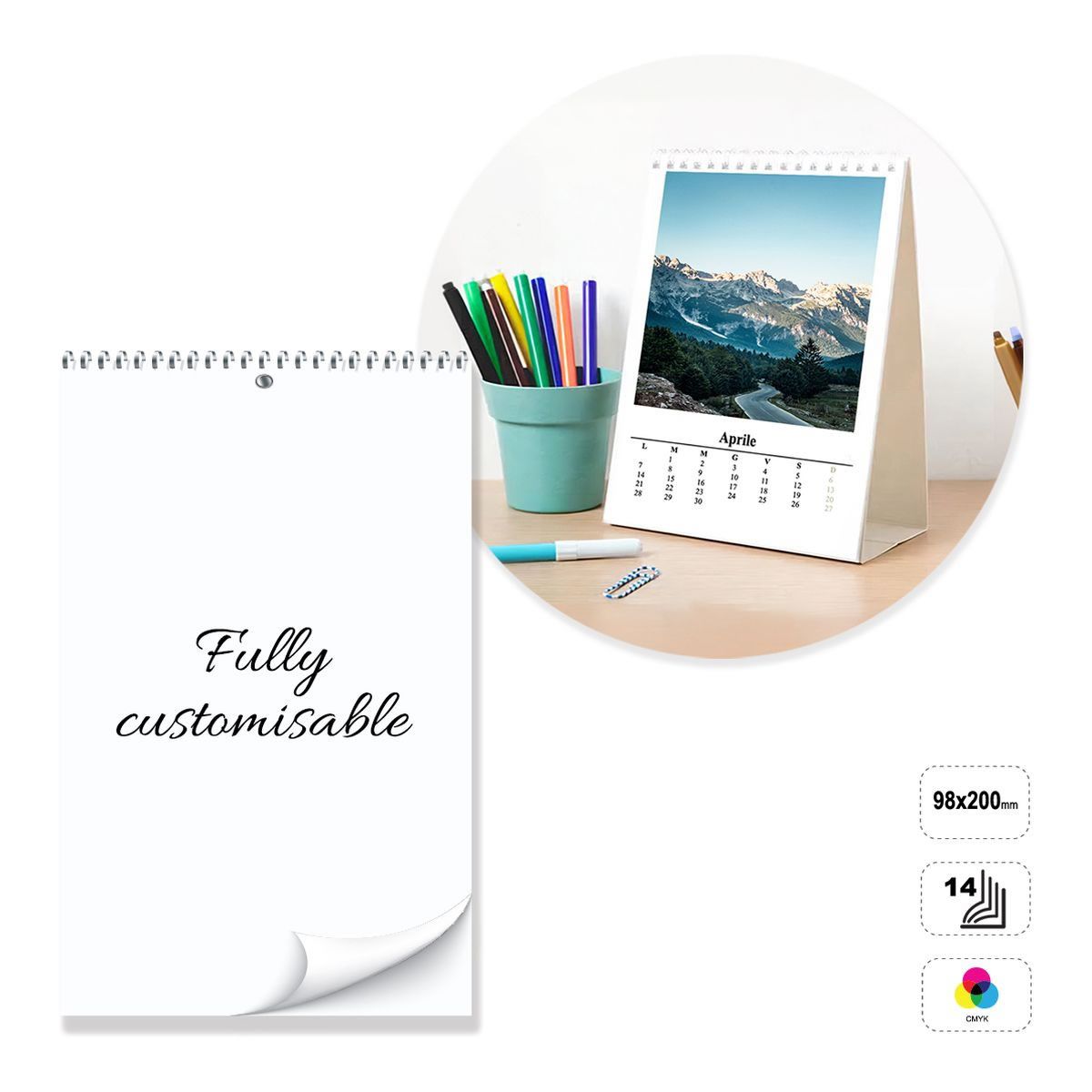 Calendario de sobremesa vertical, totalmente personalizable. El producto consta de 14 hojas de papel estucado mate de 135 g, imprimibles por el anverso o por el anverso y el reverso en cuatricromía. Encuadernado con una espiral metálica plateada, blanca o negra en la parte superior. Soporte de cartón blanco de 300 g sin imprimir. El calendario puede personalizarse modificando la plantilla prediseñada, o construirse por completo siguiendo las instrucciones en una plantilla neutra.