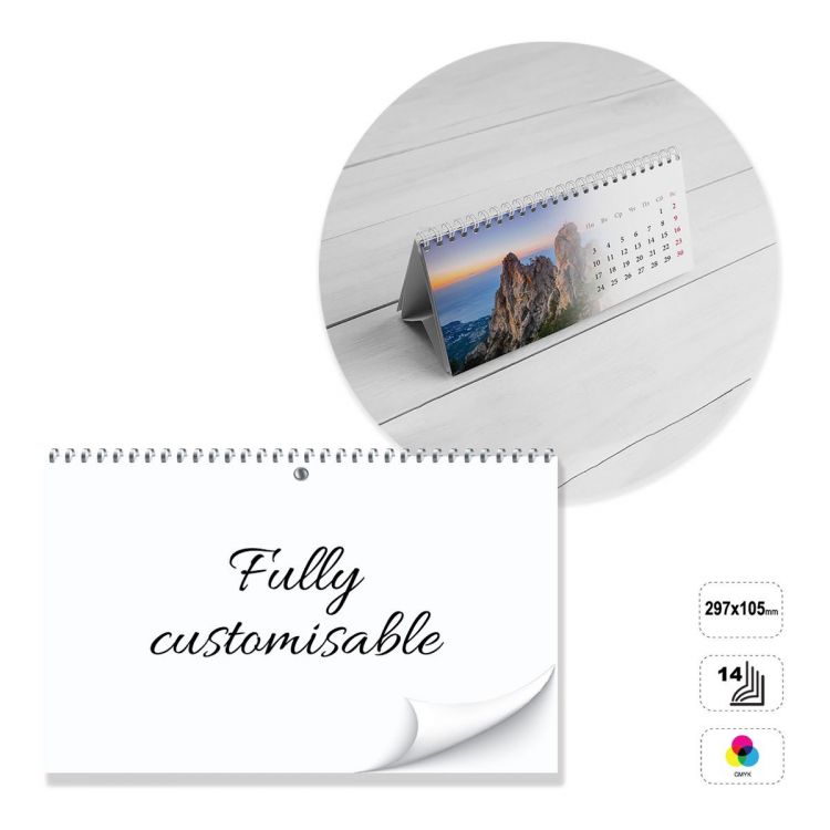 Calendario se sobremesa horizontal, totalmente personalizable. El producto consta de 14 hojas de papel estucado mate de 135 g, imprimibles por el anverso o por el anverso y el reverso en cuatricromía. Encuadernado con una espiral metálica plateada, blanca o negra en la parte superior. Soporte de cartón blanco de 300 g sin imprimir. El calendario puede personalizarse modificando la plantilla prediseñada, o construirse completamente siguiendo las instrucciones en una plantilla neutra.