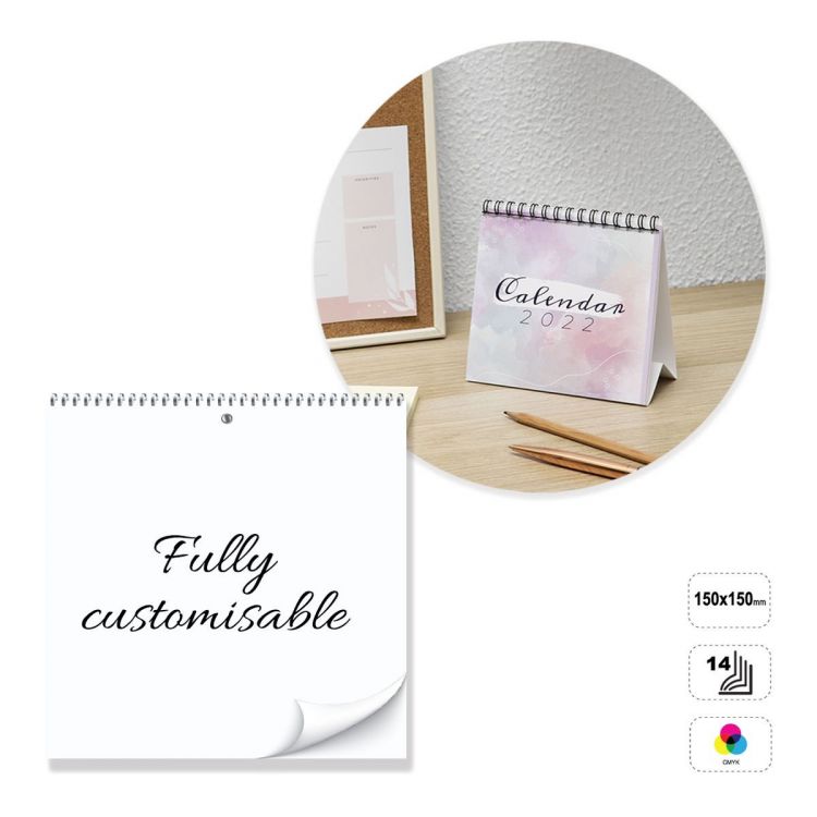Calendario de sobremesa cuadrado, totalmente personalizable. El producto consta de 14 hojas de papel estucado mate de 135 g, imprimibles por el anverso o por el anverso y el reverso en cuatricromía. Encuadernado con una espiral metálica plateada, blanca o negra en la parte superior. Soporte de cartón blanco de 300 g sin imprimir. El calendario puede personalizarse modificando la plantilla prediseñada, o construirse por completo siguiendo las instrucciones en una plantilla neutra.