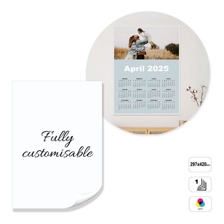 Planificador anual vertical, totalmente personalizable. El producto está fabricado en papel estucado mate de 350 g, imprimible en el anverso en cuatricromía. Disponibilidad de acabado en el anverso brillante, mate o soft touch. El calendario puede personalizarse modificando la plantilla prediseñada, o construirse por completo siguiendo las instrucciones en una plantilla neutra.