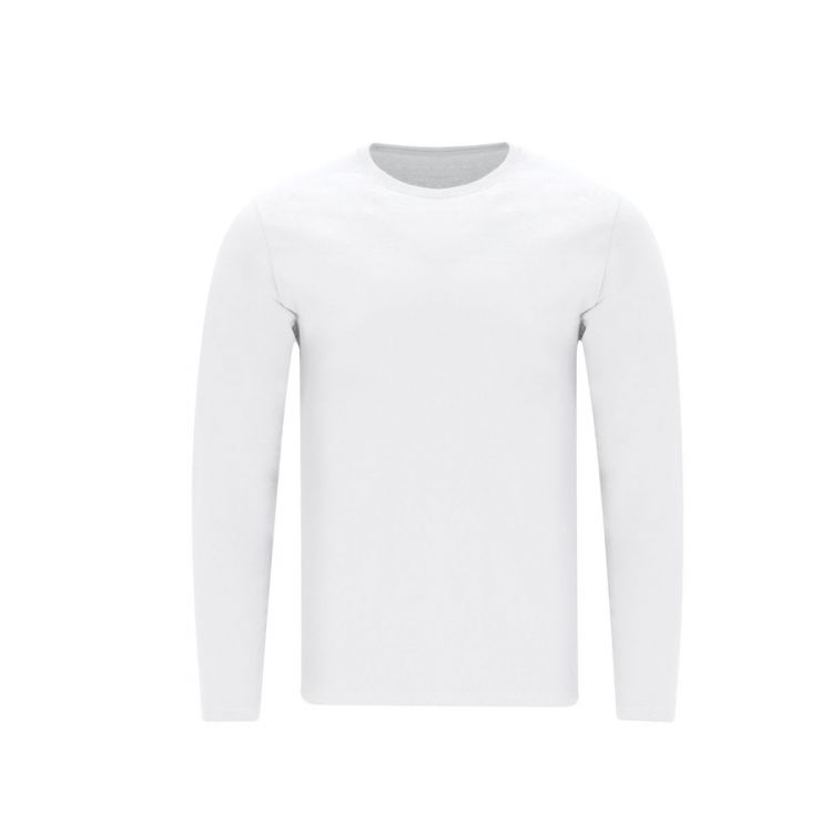 Camiseta de manga larga para adulto en color blanco de suave y agradable tacto en 100% algodón, punto liso de 160 g/m2. Confeccionada en tejido tubular, con cuello redondo acanalado 1x1 y con cubrecosturas reforzado a juego en color blanco.