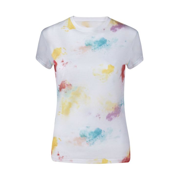 Camiseta para mujer en material 100% poliéster transpirable de 160g/m2 con textura de algodón. Con cuello redondo y atrevido diseño con estampados inspirado en una paleta de pinturas. Disponible en tallas S, M, L, XL.