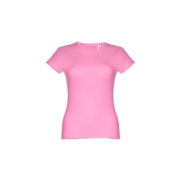 Camiseta entallada para mujer en punto jersey de algodón 100% (150 g/m²) con hilo de algodón cardado (color 183: 90% algodón/10% viscosa, color 196: 98% algodón/2% viscosa). Tiene un fino cuello de punto doble con cinta de refuerzo de raso. Pieza cortada y cosida con doble costura en mangas y bajo. Tallas: S, M, L, XL, XXL. Producto en color rosa claro, tamaño S