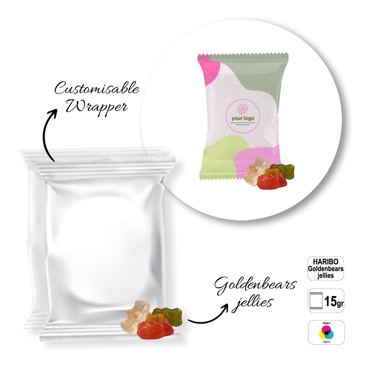 Caja de dulces. Las letras del código del producto corresponden a la forma del caramelo: A- Ositos de Oro Haribo (15 g), B- Caramelos de goma con forma de frambuesa (sabores variados: uva y sambuca) (15 g), C- Mini caramelos de colores chocolate con cacahuetes en su interior (15 g). Embalaje: sobre alimentario totalmente personalizable con posibilidad de elegir entre: sobre blanco o transparente 100% reciclable o sobre de papel kraft 100% reciclable, con adición de film alimentario en el interior del sobre [contenido de plástico en el embalaje < 65%], ( (elección del acabado al realizar el pedido). Vida útil mínima: 6 meses.