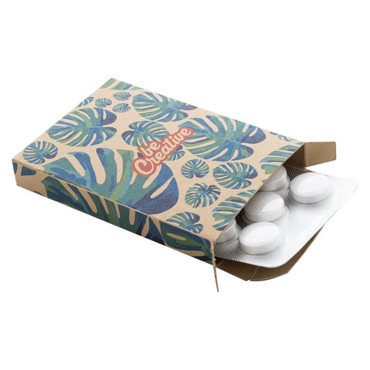 10 caramelos de menta de tamaño grande en blíster con caja de papel kraft personalizada, impresa a todo color. Cantidad mínima: 100 unidades