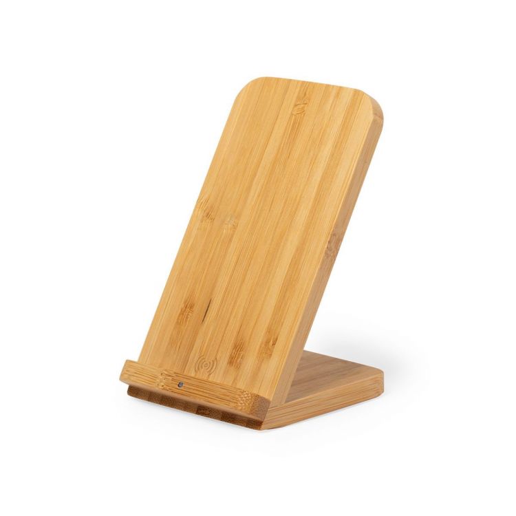 Cargador inalámbrico de línea nature con función soporte para smartphone. Hecho en bambú procedente de cortes naturales. Indicador de estado de carga y compatible con dispositivos equipados con tecnología de carga inalámbrica. Amplia superficie de marcaje y presentado en atractiva caja de diseño eco. (color natural)